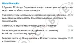 В переписке одного из внутренних чатов группы Пригожина, представитель российского олигарха в Судане Михаил Потепкин говорит о Добронравине как о «нашем профессоре в ООН».